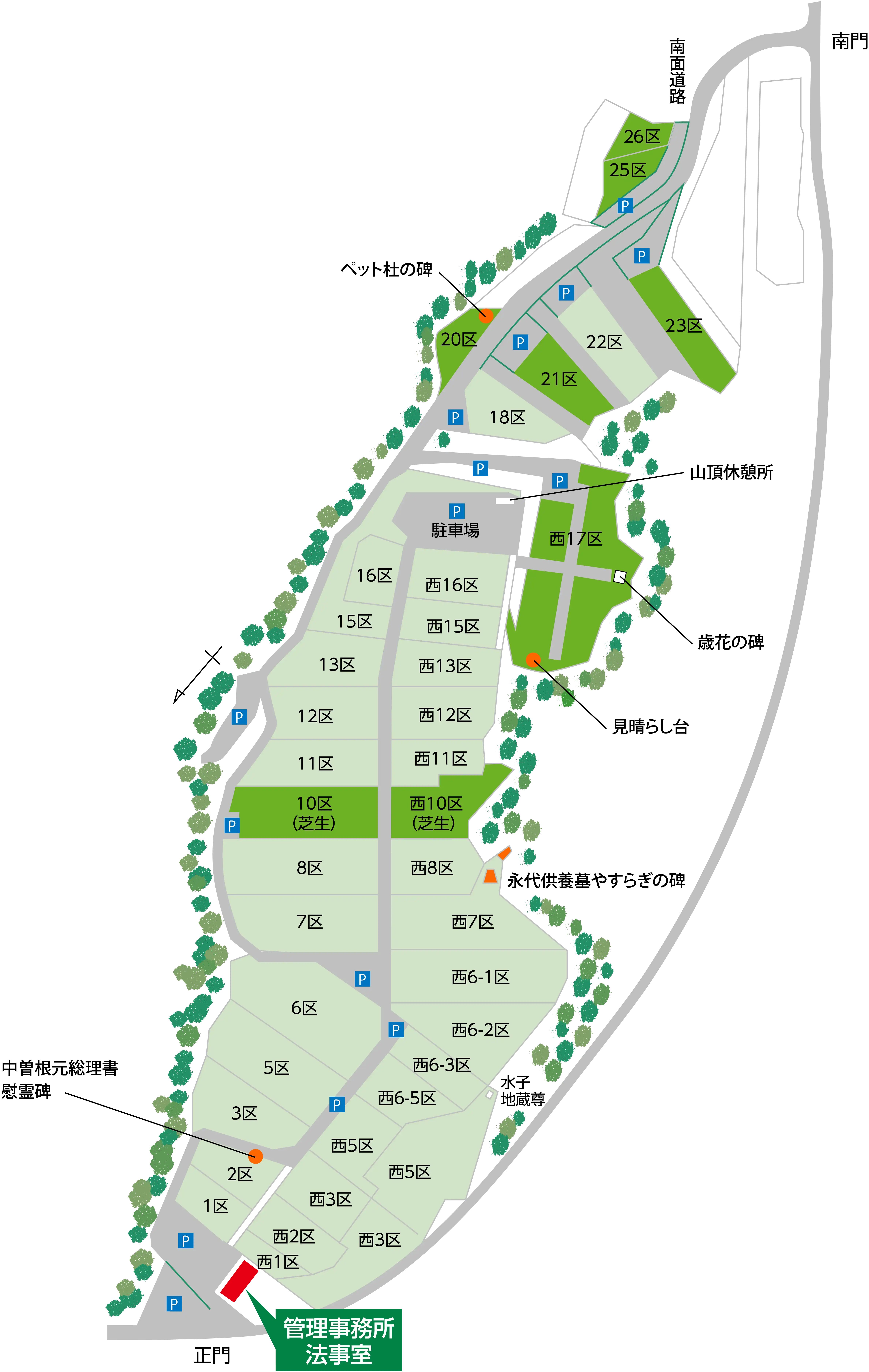 管理事務所正門の傍にあり、墓地の案内やご相談、各種手続きを承ります。建物内にはご自由に利用できる待合室や納骨法要・年忌法要などに利用できる法事室も備えています。